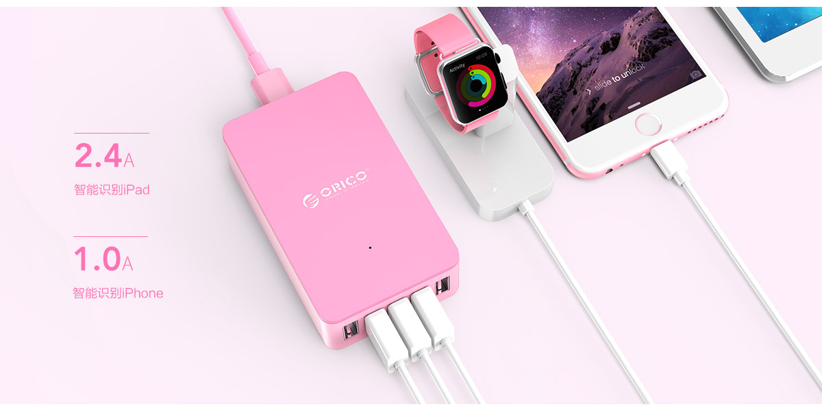 40W大功率輸出以確保五臺設備全速充電,單口可達2.4A電流輸出,實現多設備同時充電。