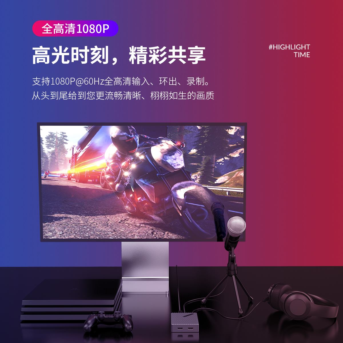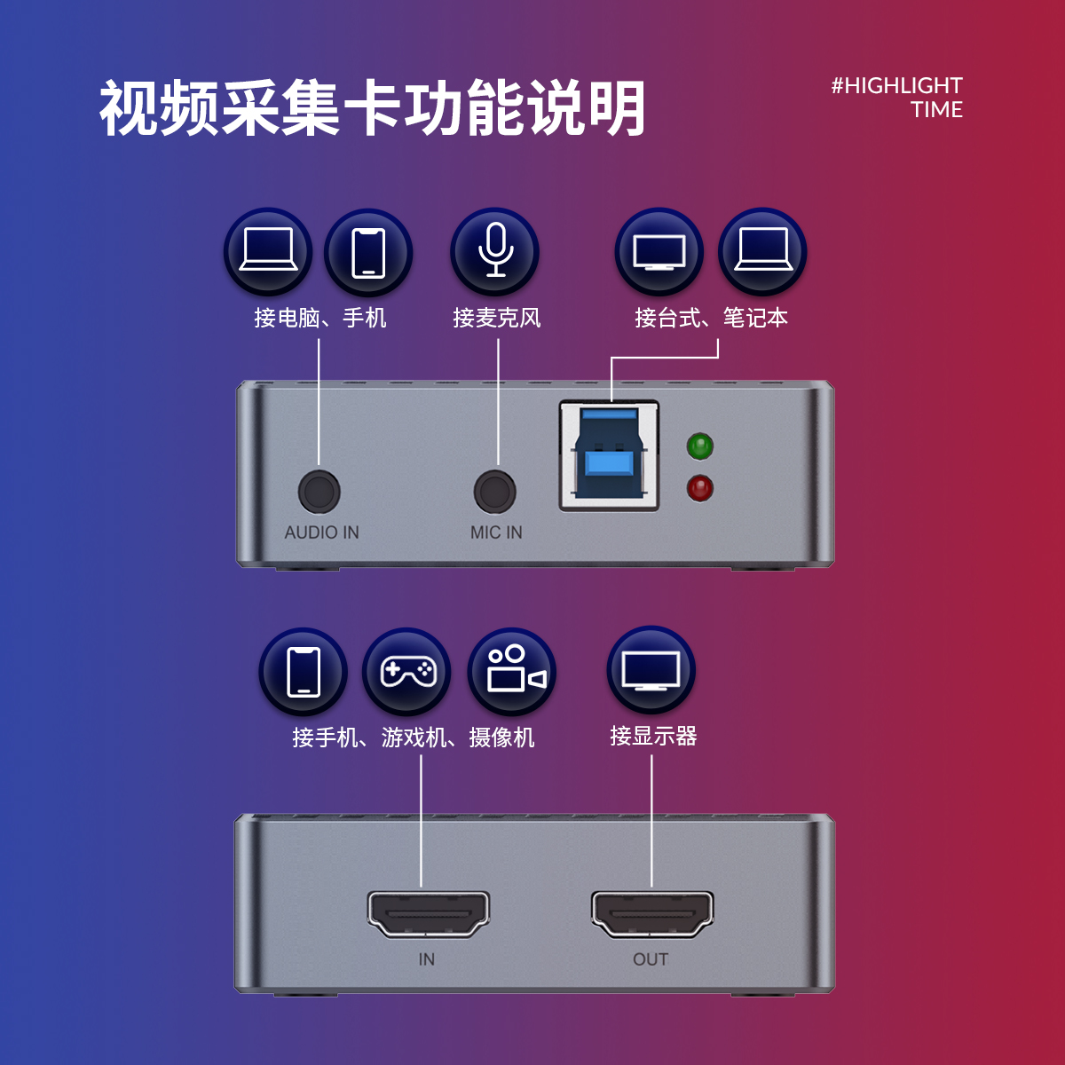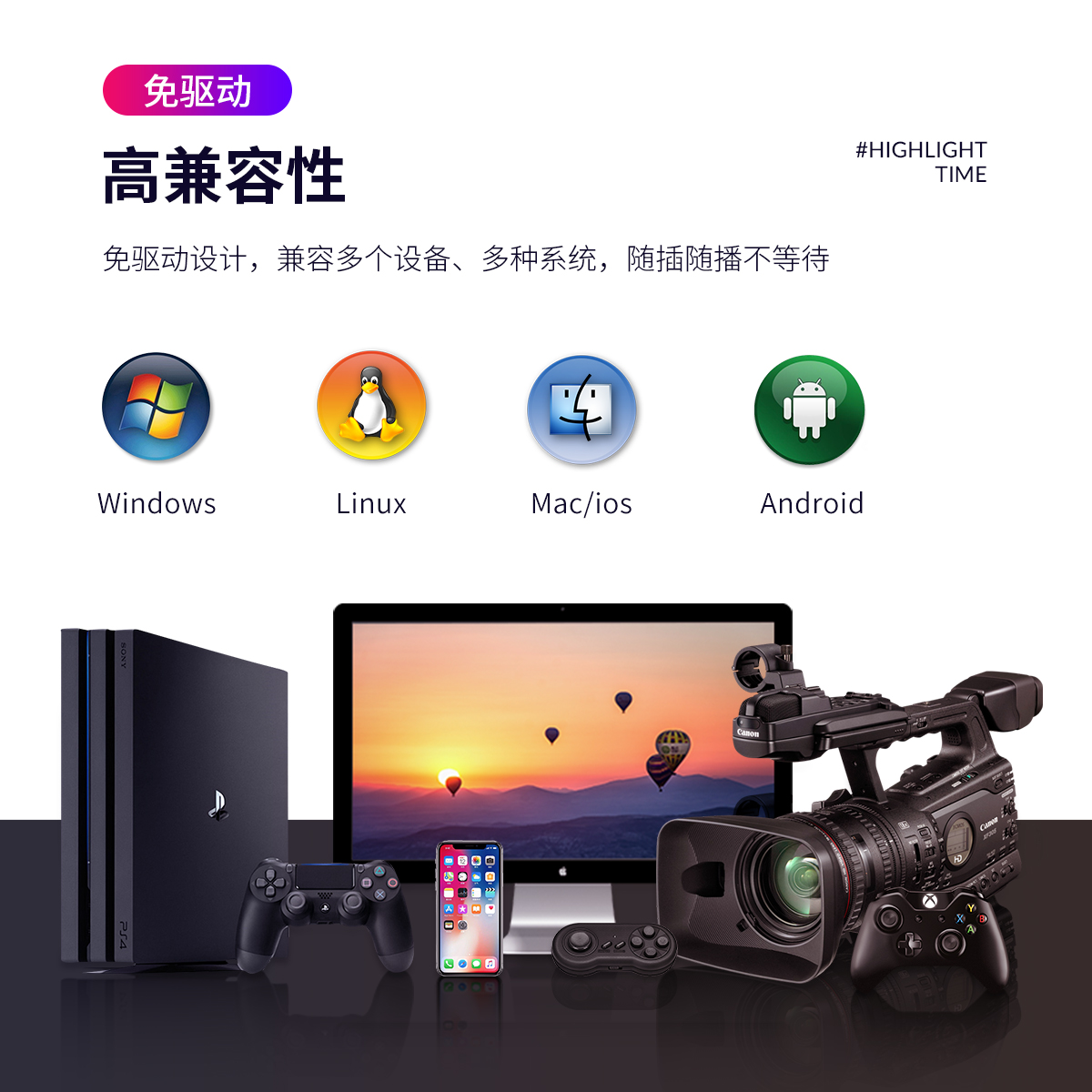HDMI轉(zhuǎn)USB3.0采集卡,支持1080P@60Hz全高清輸入、環(huán)出、錄制,支持麥克風(fēng)輸入和背景音樂(lè)輸入, 外殼主體由品質(zhì)鋁合金打造,免驅(qū)動(dòng)設(shè)計(jì),兼容多個(gè)設(shè)備、多種系統(tǒng),