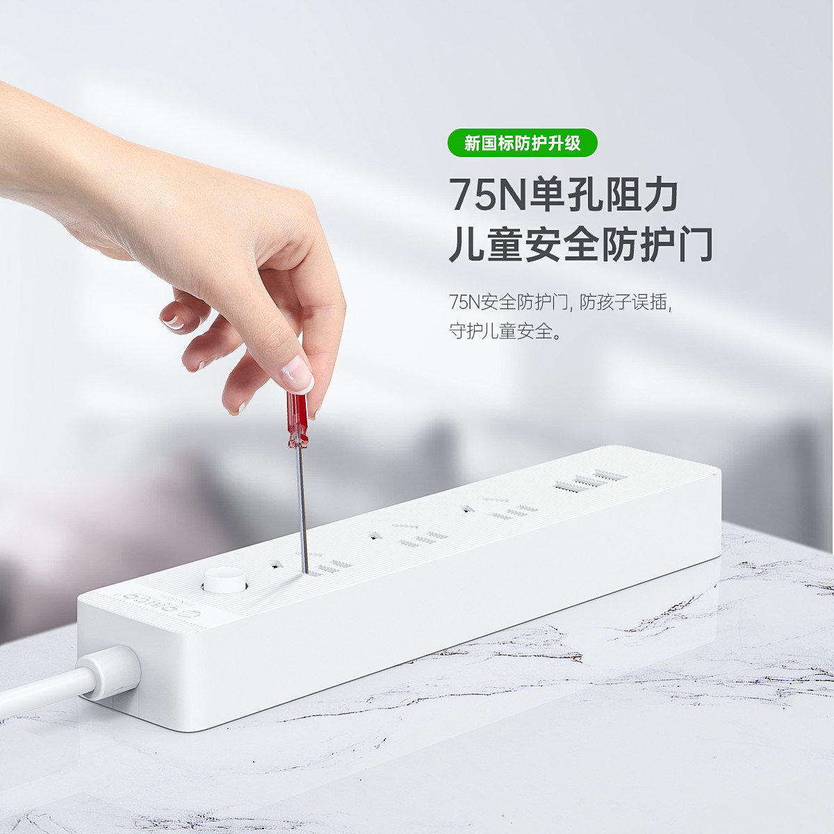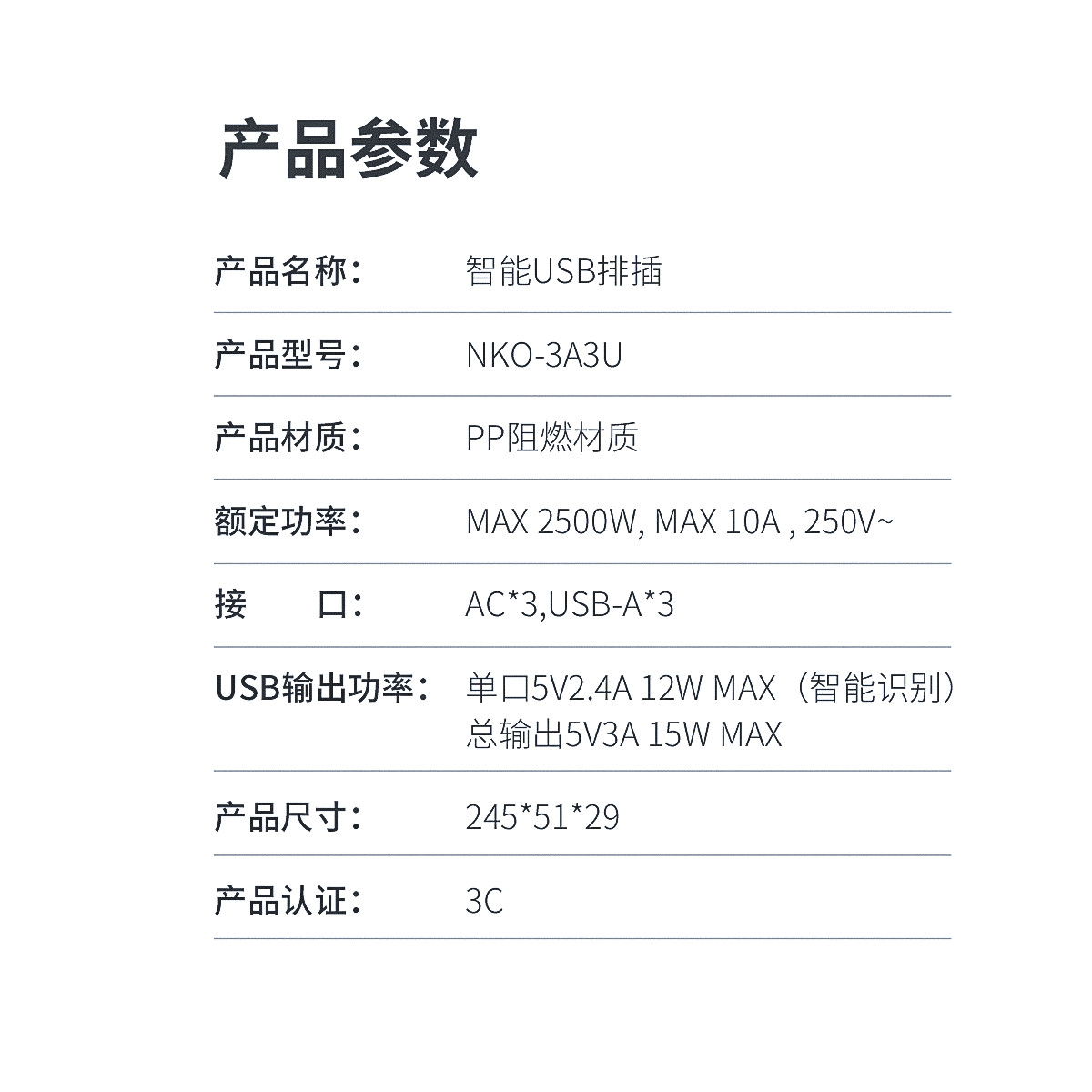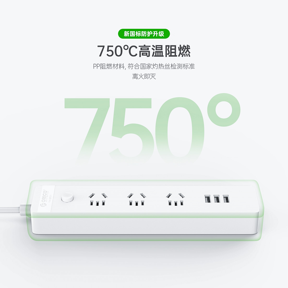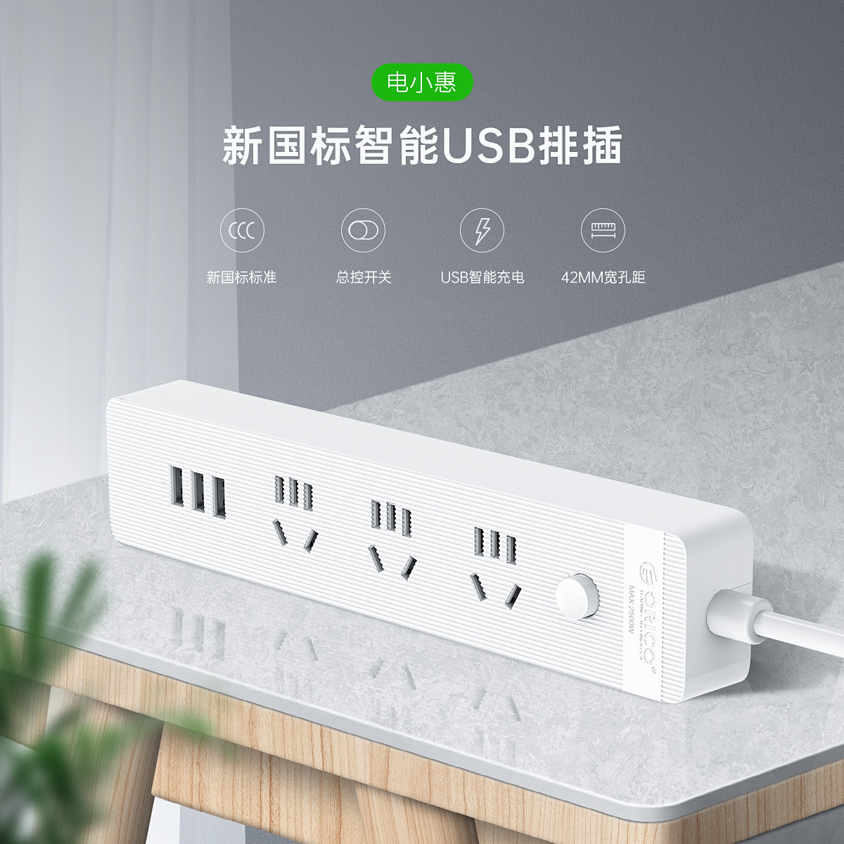 智能USB排插,USB單口MAX12W智能充電,750°C高溫阻燃,三芯一體式銅芯線,有1米、1.8米、2.8米3種線長規(guī)格,