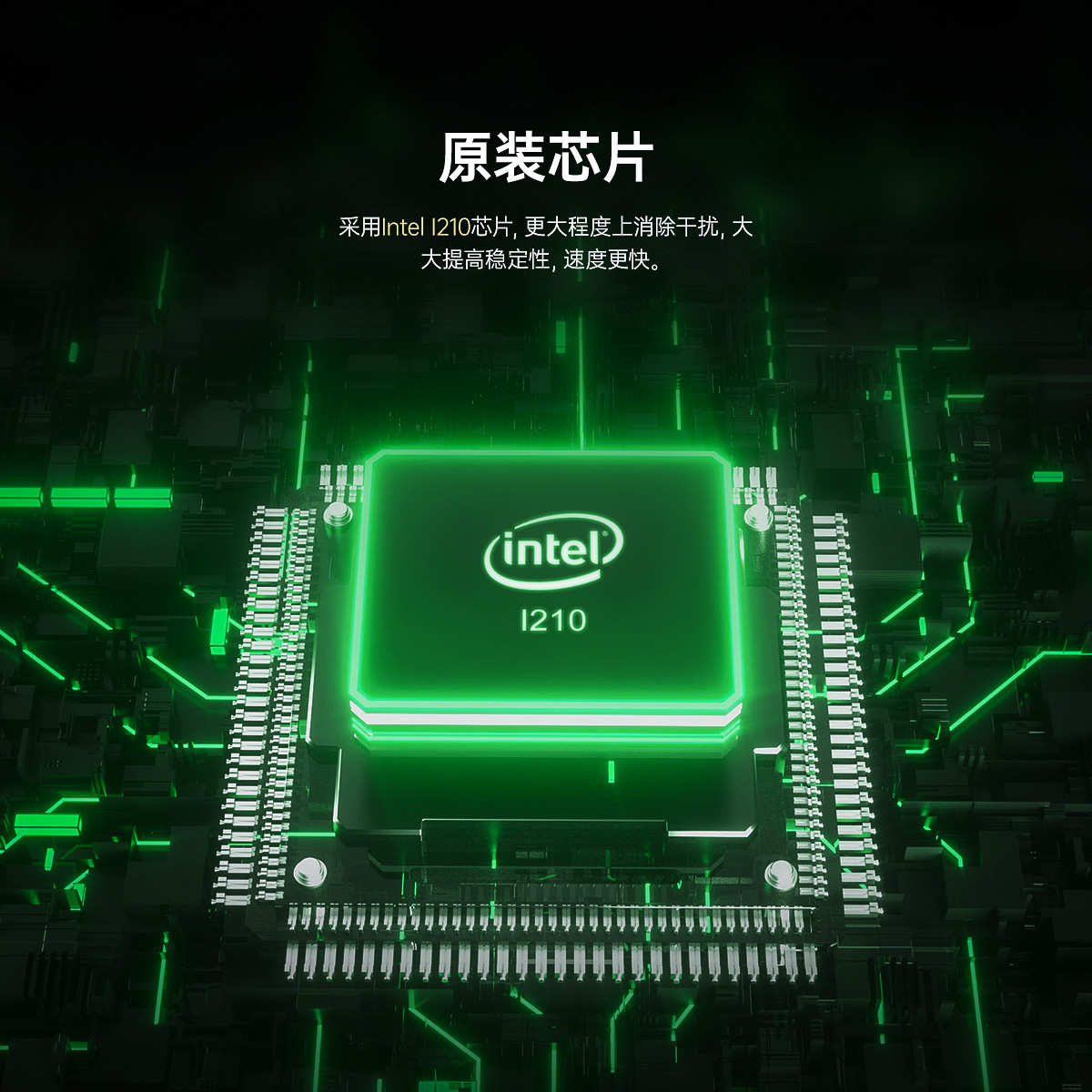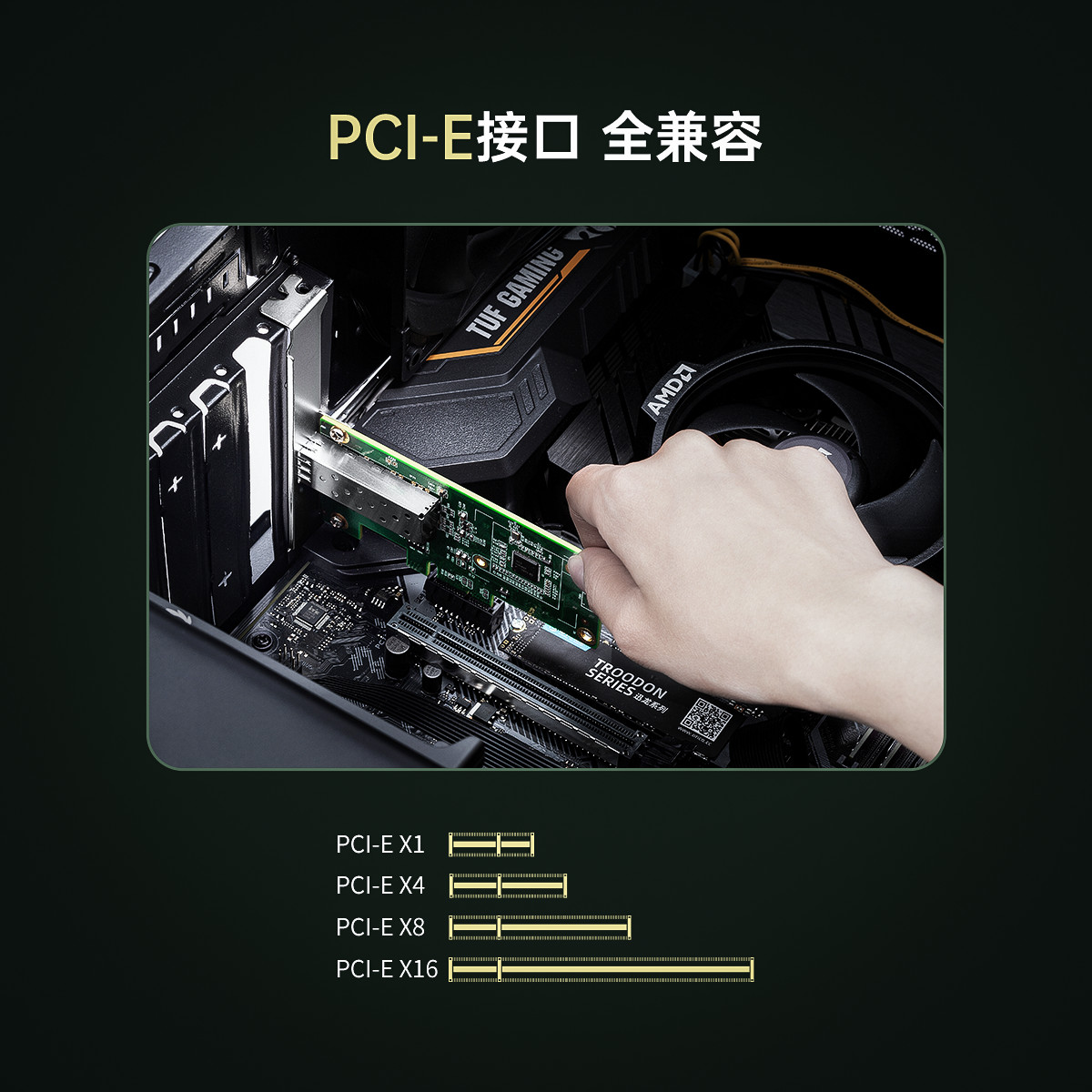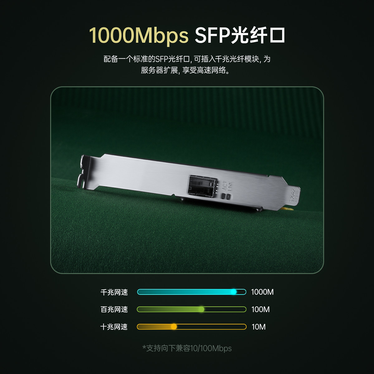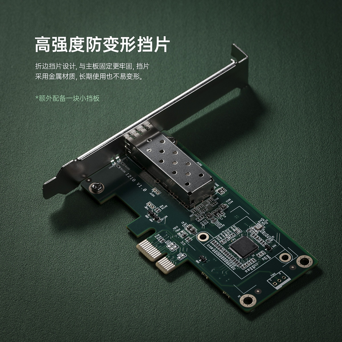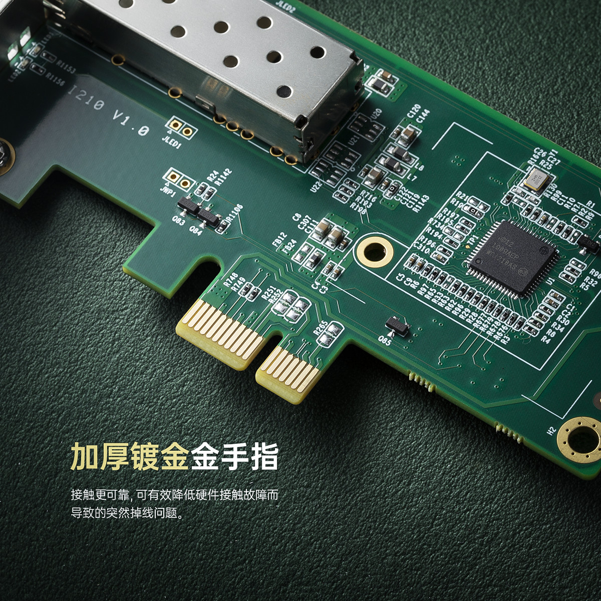 PCl-E插槽│強(qiáng)勁散熱|高速穩(wěn)定,配備一個(gè)標(biāo)準(zhǔn)的SFP光纖口,可插入千兆光纖模塊,采用Intel 1210芯片,更大程度上消除干擾