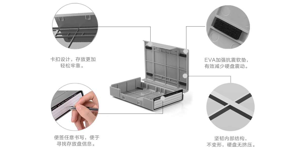 健康、無毒是現(xiàn)代人對日常用品的一項(xiàng)基本要求,為了迎合當(dāng)今的環(huán)保理念,我們采用了無論是物理性能還是熱性能、電性能都很好的PP料,在日韓等國家PP材料被廣泛用于微波餐具等產(chǎn)品,ORICO采用PP材料制作的硬盤收納盒,嚴(yán)絲合縫,確保您的硬盤存放多年依舊如新,不受水汽、靜電、塵埃的侵?jǐn)_。