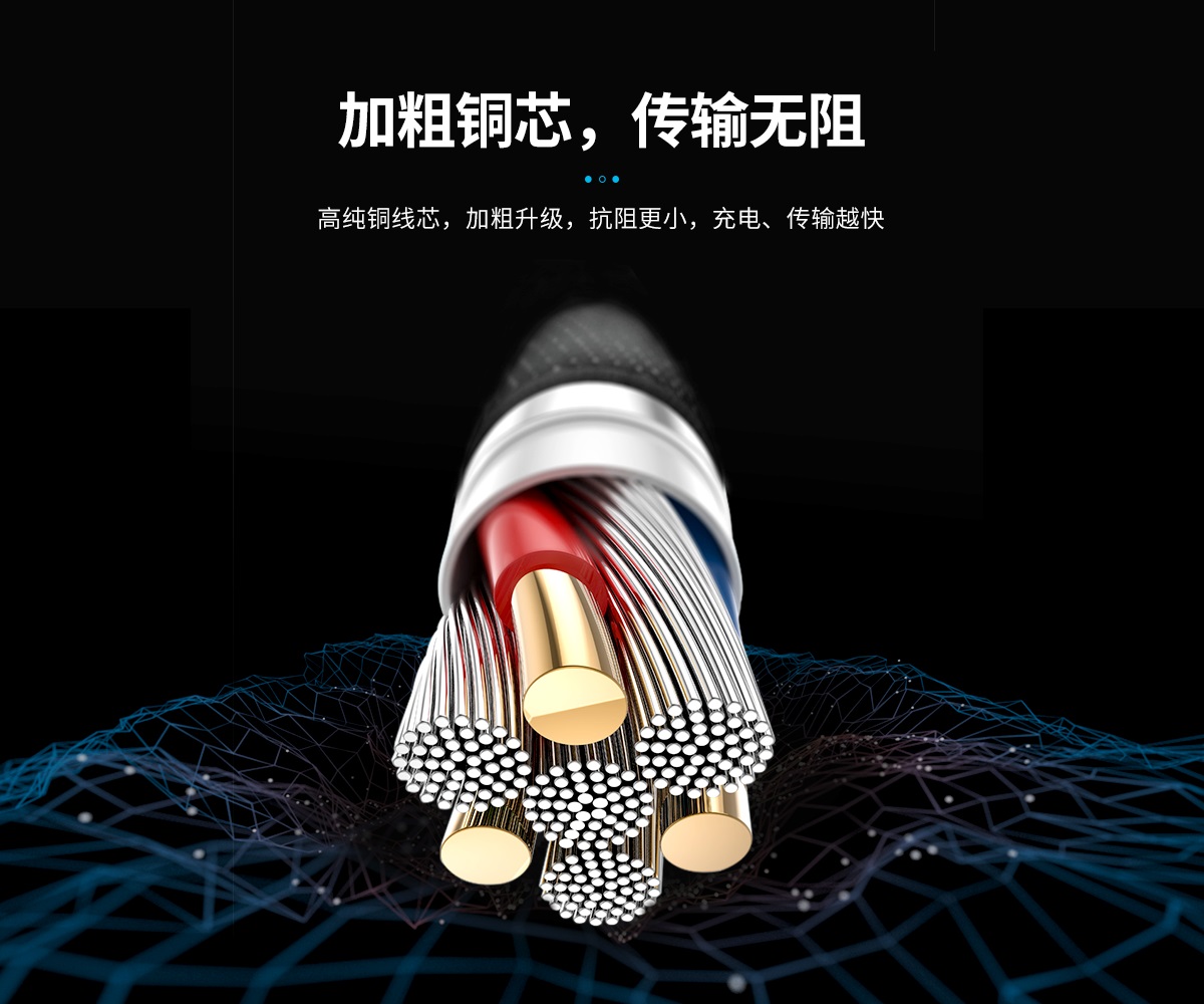 高純銅線芯,加粗升級(jí),抗阻更小,充電、傳輸越快